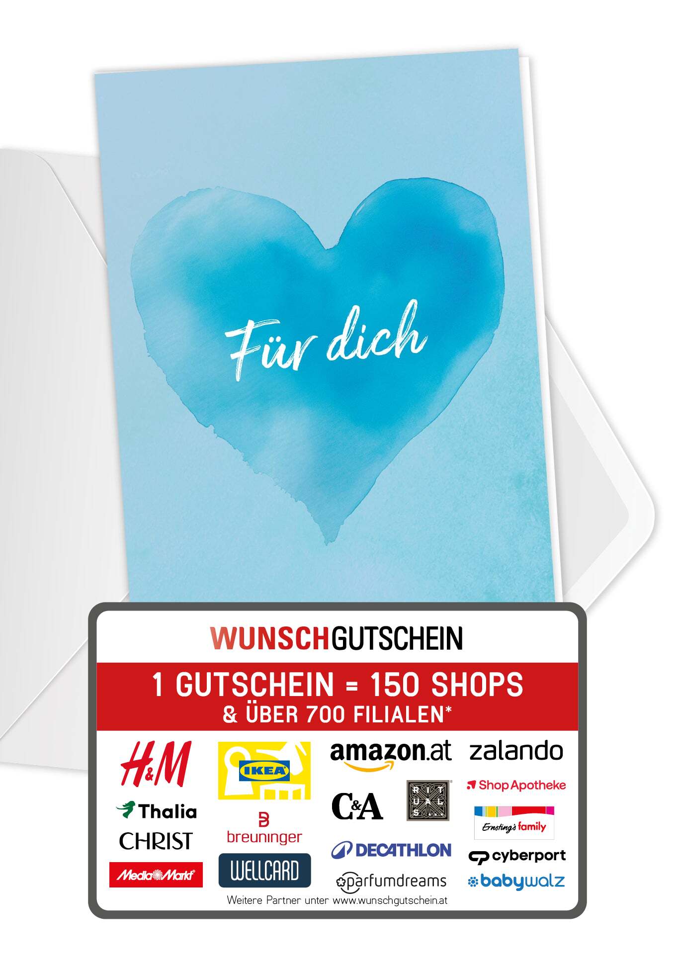 WUNSCHGUTSCHEIN ist das perfekte Geschenk: Verschenke den Gutschein, der bei über 100 Online-Shops einlösbar ist – Von A wie Amazon bis Z wie Zalando. Du liegst mit deinem Geschenk also immer richtig! WUNSCHGUTSCHEIN ist in den Wertstufen 15, 25, 50, 100 und 150 Euro erhältlich.