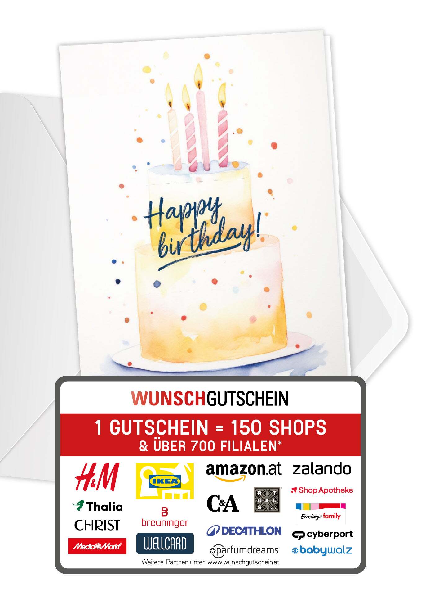 WUNSCHGUTSCHEIN ist das perfekte Geschenk: Verschenke den Gutschein, der bei über 100 Online-Shops einlösbar ist – Von A wie Amazon bis Z wie Zalando. Du liegst mit deinem Geschenk also immer richtig! WUNSCHGUTSCHEIN ist in den Wertstufen 15, 25, 50, 100 und 150 Euro erhältlich.