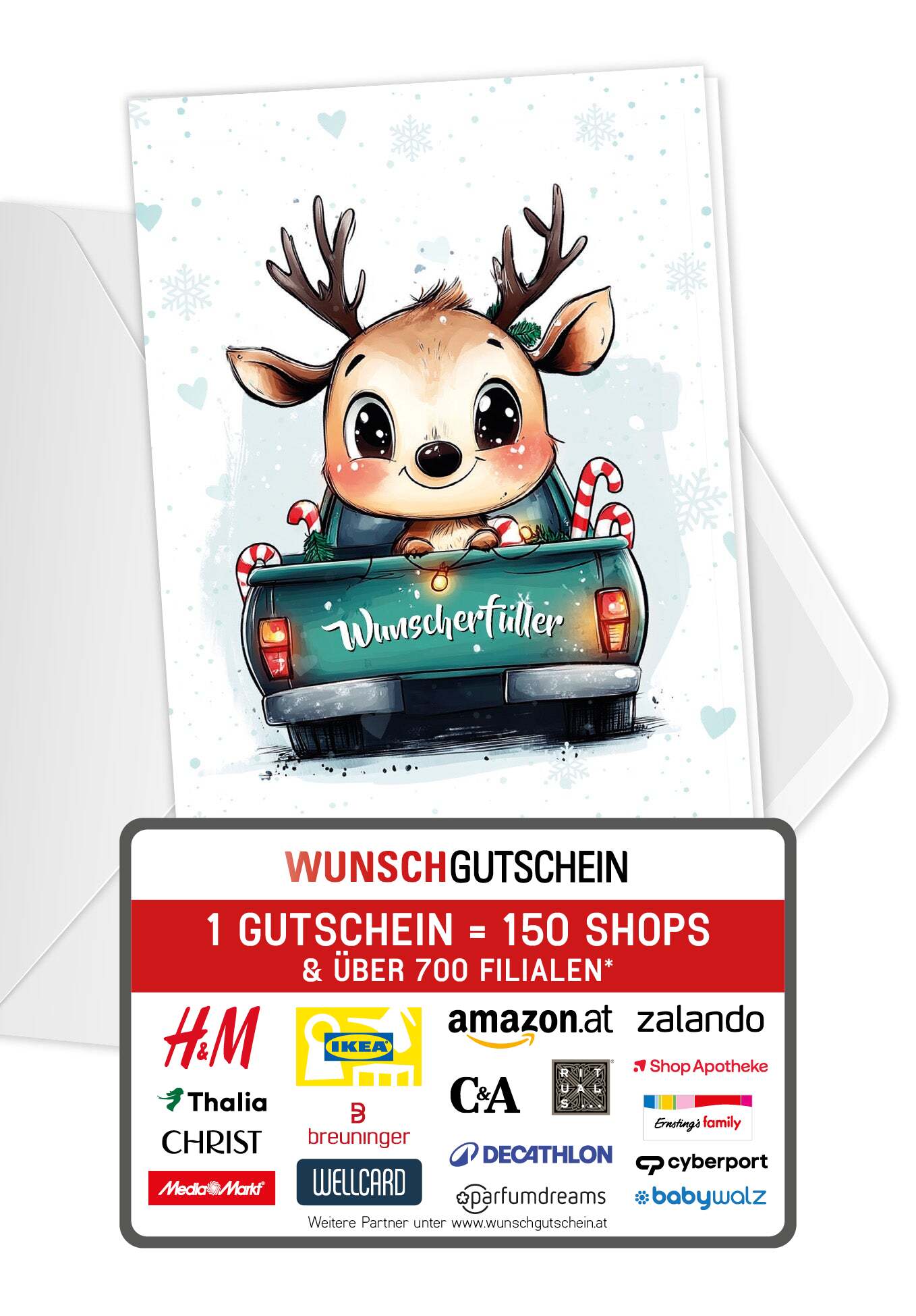 WUNSCHGUTSCHEIN ist das perfekte Geschenk: Verschenke den Gutschein, der bei über 100 Online-Shops einlösbar ist – Von A wie Amazon bis Z wie Zalando. Du liegst mit deinem Geschenk also immer richtig! WUNSCHGUTSCHEIN ist in den Wertstufen 15, 25, 50, 100 und 150 Euro erhältlich.